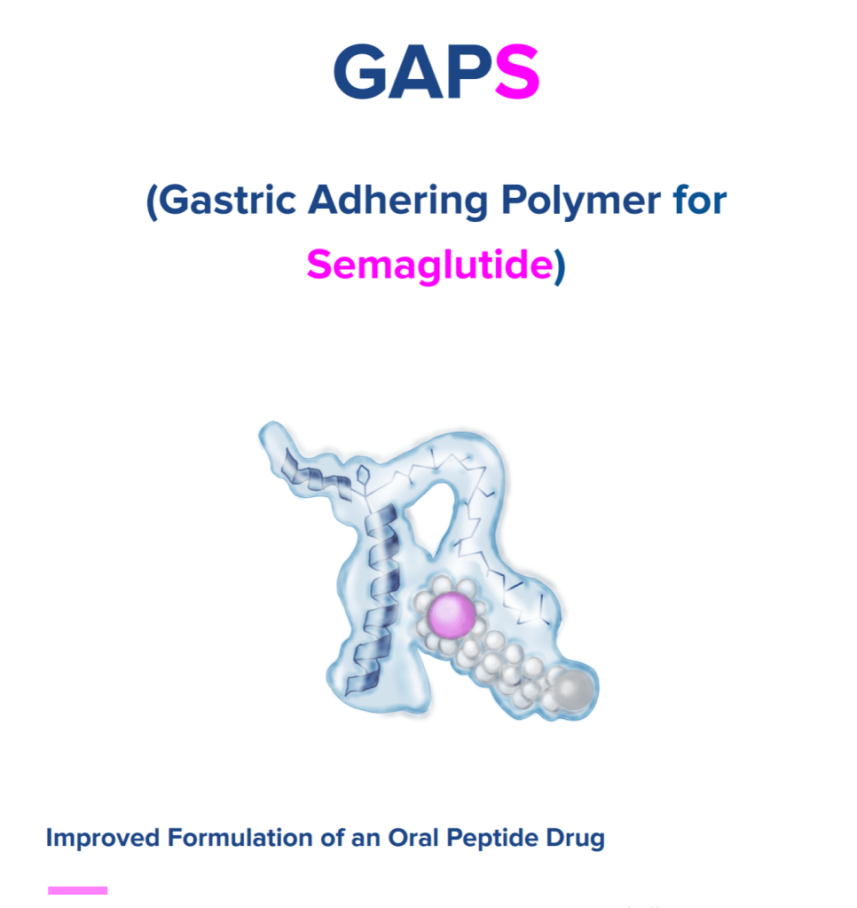 We present GAPS (Gastric Adhering Polymer Solution) as an innovative method to optimize the formulation of the oral peptide drug semaglutide (Rybelsus®). After an extensive literature review and rigorous process of analysis from the initial semaglutide molecule we can conclude that Novo Nordisk’s oral semaglutide is a safe and efficacious molecule hitting the correct target. Moreover, the study carried by Buckey et al., confers robust evidence that transepithelial absorption through the transcellular route is effective. However, we could identify the problems facing the absorption of the molecule with the concomitant administration of food allowing us to provide a solution based on the selective adhesion of the oral semaglutide tablet to the gastric mucus rich in mucins. Conjugating semaglutide – SNAC – GAPS we obtain a functionalized biopolymer in a form of microspheres that targets mucin type MUC5AC and achieve a selective fixation of semaglutide that could not be displaced by food, fluids or other drugs. GAPS provides a selective adhesion to human gastric parietal cells avoiding fluid – food dispersion effect on the semaglutide in the stomach, maintaining the protective effects of SNAC against proteolytic enzymes and increasing the remaining time on the gastric pit to enhance absorption of semaglutide through the ranscellular route. The creation of GAPS was inspired on biomimicry with the firm adhesion mechanism of the Helicobacter pylori bacteria which selectively adheres to the mucin type MUC5AC, very abundant at the gastric pit, where semaglutide is absorbed, in the same place where the bacteria penetrates to the parietal cell to parasite the stomach. GAPS can be formulated in thiolated chitosan nanoparticles intended to be administered any time of day, swallowed through the enteral route, with the potential to perform better than the current oral dosage form of semaglutide and being able to be taken with other oral medications. Our solution is based upon the current formulation in a solid oral dosage with the dimensions of 7.5 mm 13.5 mm. GAPS facilitates oral absorption of semaglutide and is stable at room temperature, with good organoleptic properties. As well as being environmentally friendly and contains ingredients that are generally recognized as safe. GAPS allows the seeker to manufacture the active principle on a large – scale and provides the seeker freedom to practice and is available for potential licensing. There is no third party patent art so commercial application is subject only to our agreement.